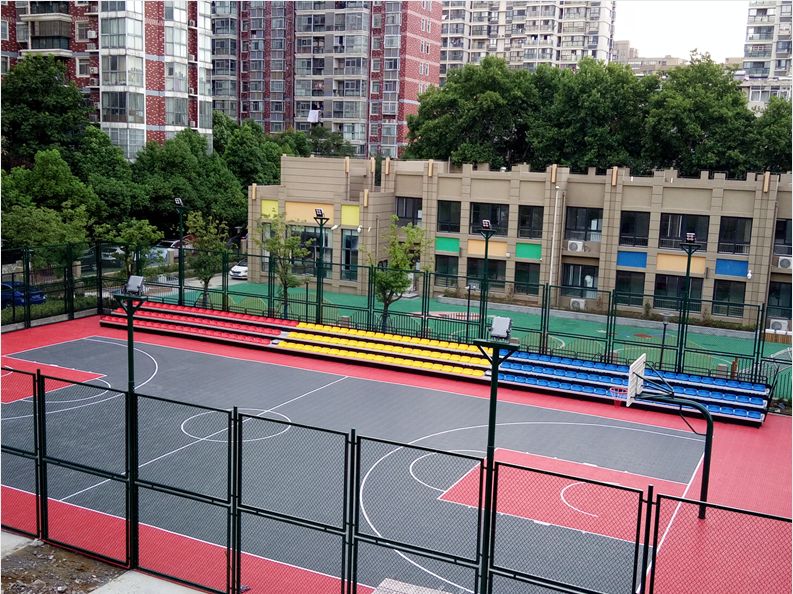 該地板主要采用改性PP(聚丙烯)為原材料有效解決地板熱脹冷縮問題的同時(shí),還具有穩(wěn)定的表面摩擦,抗紫外線添加劑被加入到每一塊地板中,能夠保障地板在長(zhǎng)期受日光照射中不褪色,懸浮式的結(jié)構(gòu)設(shè)計(jì),加上堅(jiān)固的加強(qiáng)型支撐腳結(jié)構(gòu),防滑的表面可有效防止運(yùn)動(dòng)損傷,籃球場(chǎng)地紅黑相間的地面,周邊還有能容納200人的座椅,運(yùn)動(dòng)感十足又不失溫馨大方。