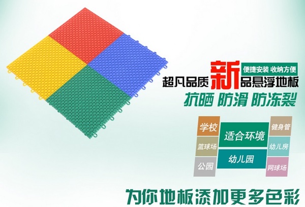 拼裝地板使用聚丙烯原料生產(chǎn),無毒無味,安全環(huán)保,河北拼裝地板廠讓人們?cè)谝粋€(gè)健康的環(huán)境下玩耍;拼裝地板具有減震、能量回送性能及側(cè)向緩沖功能,可以防止運(yùn)動(dòng)傷害;拼裝地板原料聚丙烯為高強(qiáng)度材料,加入具有抗紫外線輻射、抗氧化、抗寒等成分原料,使該產(chǎn)品具有耐壓、耐沖擊、耐低濕、使用壽命長等優(yōu)點(diǎn)。耐候性高,不怕日曬高溫、雨淋潮濕、冰雪嚴(yán)寒、不易翹曲剝落變形。拼裝地板具有特殊的排水結(jié)構(gòu),雨后場地不積水;拼裝地板可以隨時(shí)拆卸和移動(dòng),讓您隨心所欲的DIY自己理想中的場地;拼裝地板廣泛應(yīng)用于多種球場、幼兒園、賽事等,專業(yè)的運(yùn)動(dòng)性能有目共睹。